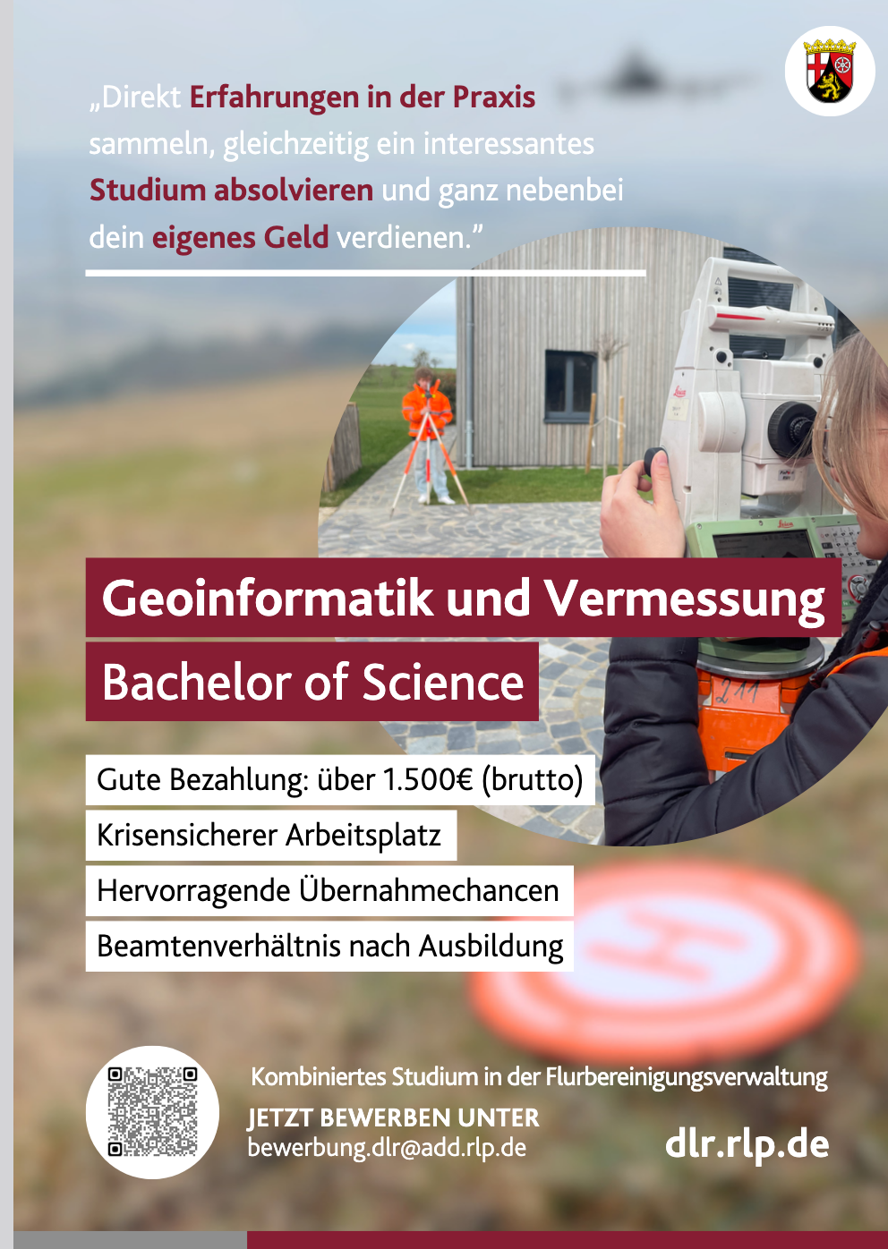 Die Flurbereinigungsverwaltung des Landes Rheinland-Pfalz bildet seit einigen Jahren in Kooperation mit der Hochschule Mainz aus. Dabei wird das Studium der Geoinformatik und Vermessung mit der Laufbahnausbildung für das 3. Einstiegsamt im vermessungstechnischen Dienst kombiniert beginnt am 01. September 2026.