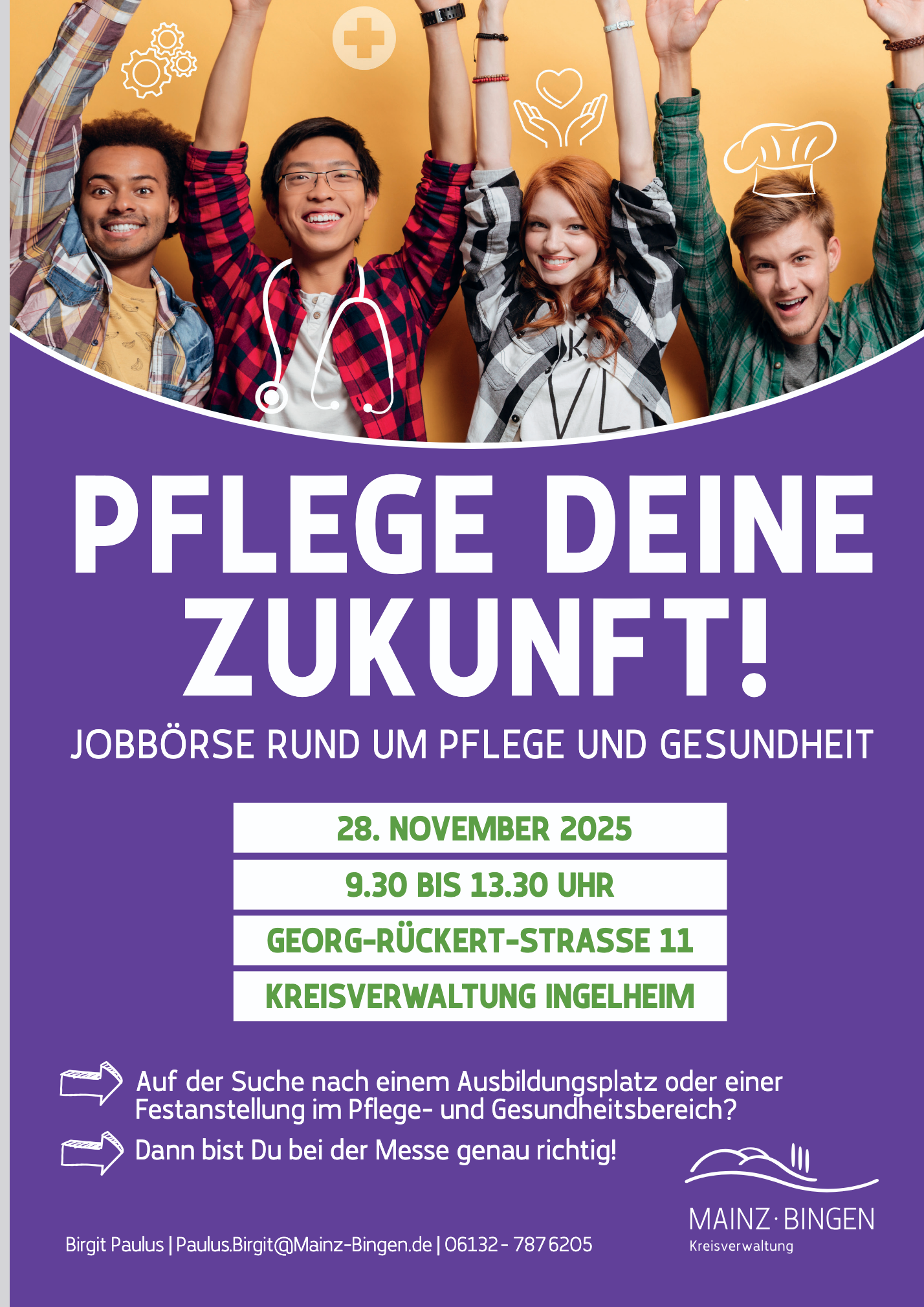 Am 28. November 2025 findet in der Kreisverwaltung die Jobbörse rund um das Thema Pflege und Gesundheit statt. Die Veranstaltung bietet die Möglichkeit, direkt mit Ausbildungsbetrieben/Arbeitgebern ins Gespräch zu kommen, sich über vielfältige Ausbildungsberufe und Arbeitsstellen zu informieren und wertvolle Kontakte für den Start ins Berufsleben zu knüpfen. Die anwesenden Betriebe werden sowohl Arbeits- als auch Ausbildungsangebote im Gepäck haben.