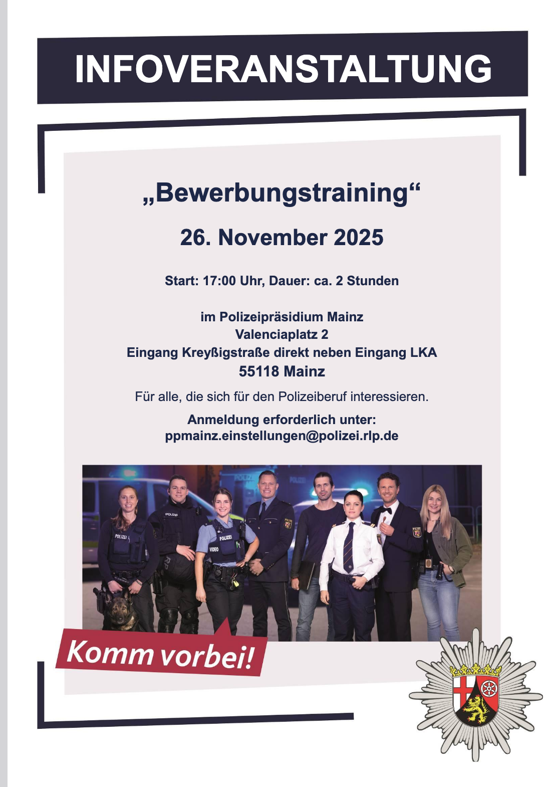 Am Mittwoch, dem 26.11.2025 bietet die Polizei RLP in Mainz wieder ein Bewerbungstraining für alle am Polizeiberuf Interessierten an.