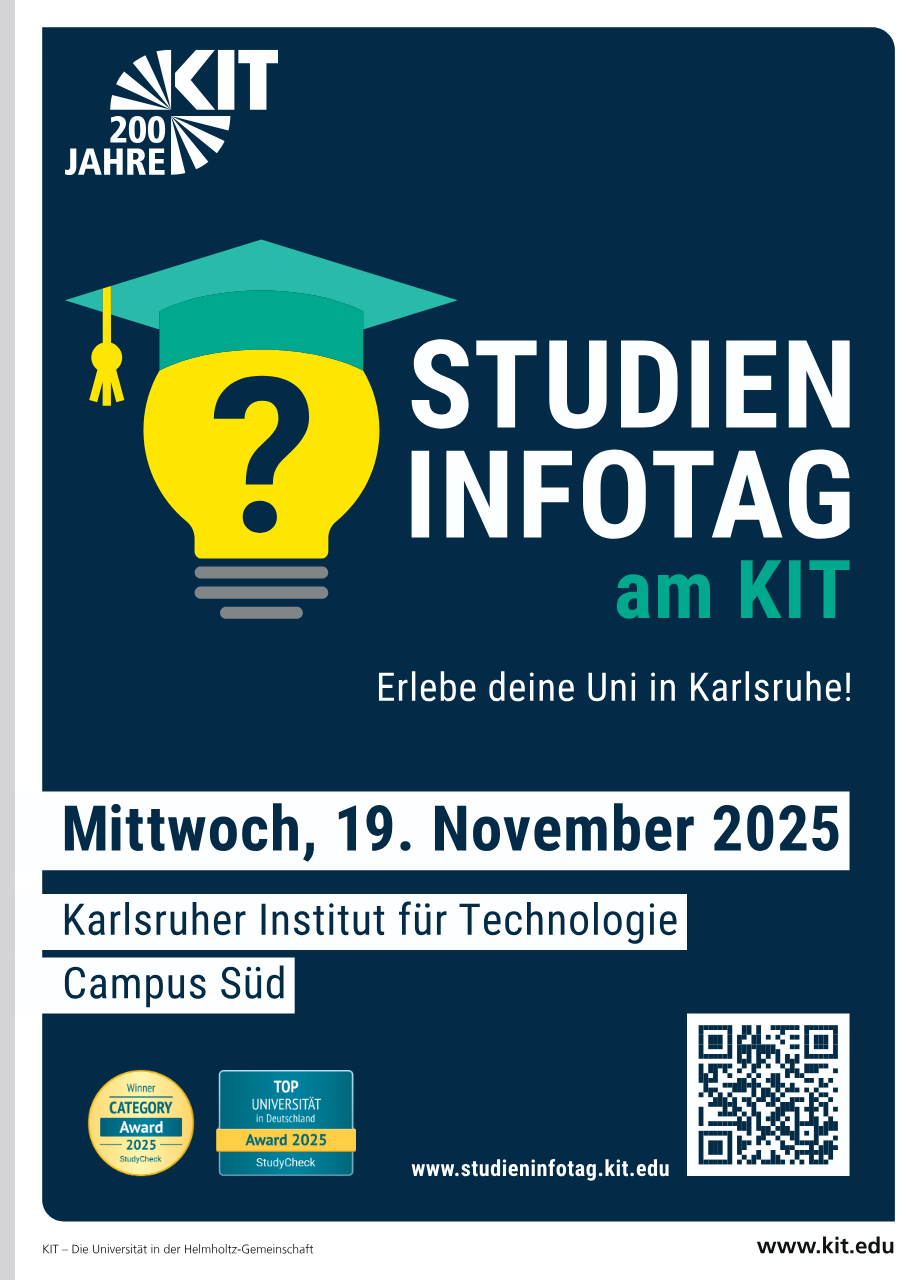 Am Mittwoch, den 19. November 2025, lädt das Karlsruher Institut für Technologie (KIT) Schülerinnen und Schüler der Oberstufe herzlich zum landesweiten Studieninfotag auf dem Campus Süd ein.
