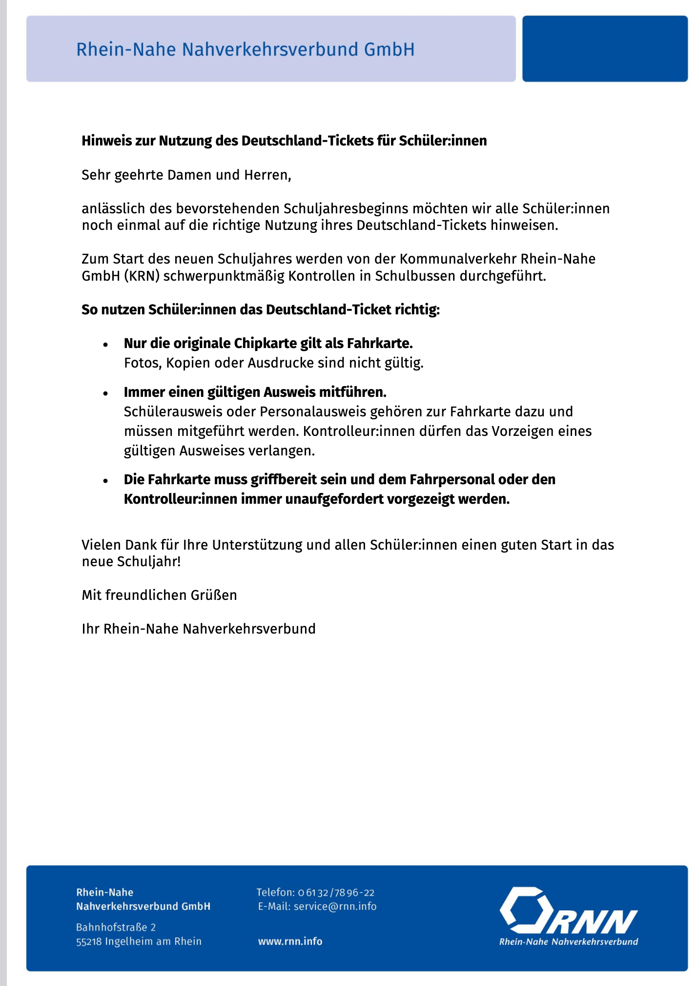 Bei Verlust des Deutschlandtickets können Sie mit diesem Formular für 40€ ein Ersatz-D-Ticket beantragen. Bitte schicken Sie es ausgefüllt per Mail an abo@krn-mobil.de und parallel an die Kreisverwaltung (schuelerbefoerderung@mainz-bingen.de), damit diese schnellstmöglich eine vorläufige Fahrkarte ausstellen kann. Diese kann zeitnah im Sekretartiat abgeholt werden und berechtigt die Schüler bis zur Ausstellung des Ersatz-D-Tickets, von ihrem Wohnort zur Schule (NICHT deutschlandweit!) den öffentlichen Nahverkehr zu nutzen.