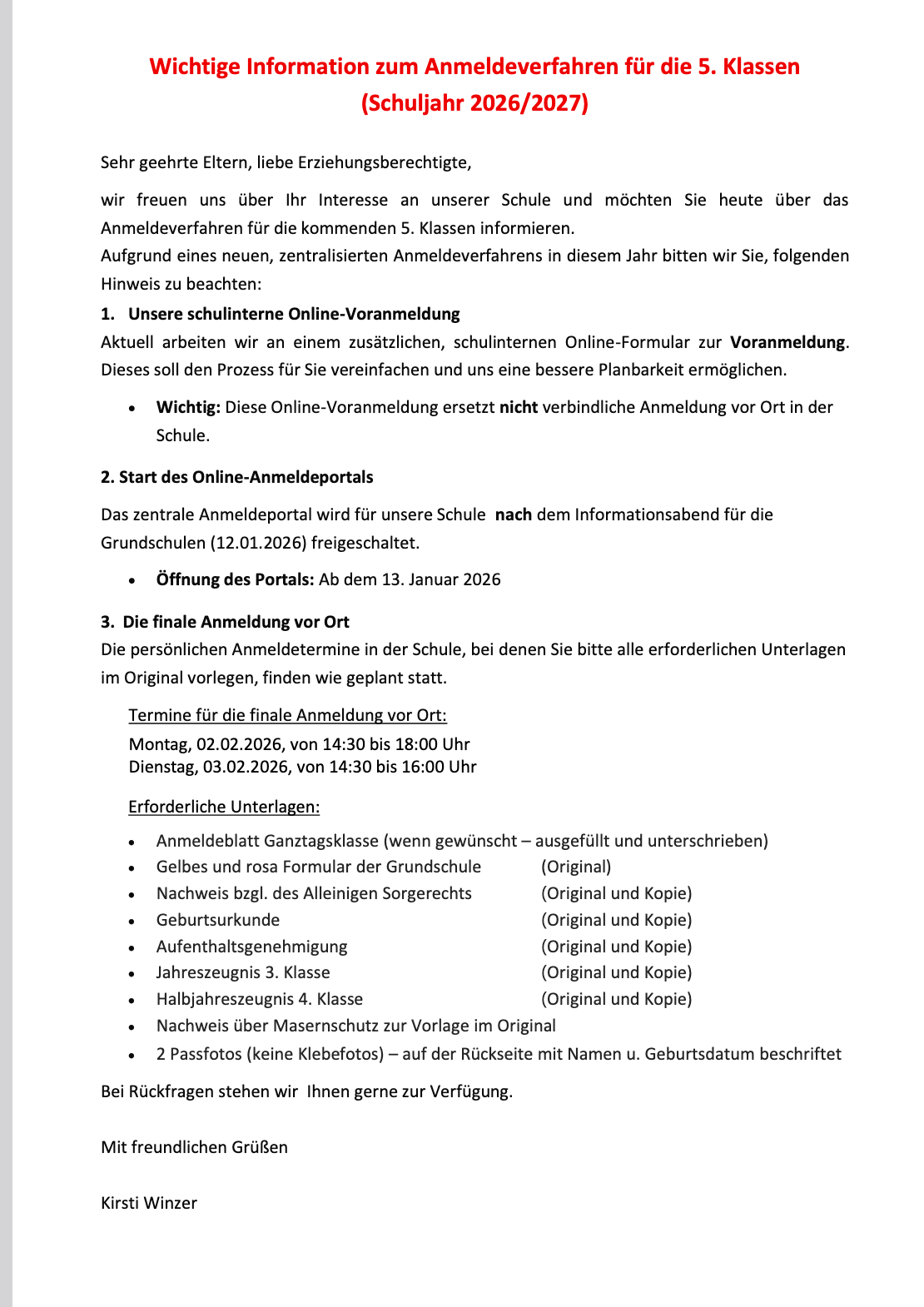 Aufnahme in die 5. Klasse
