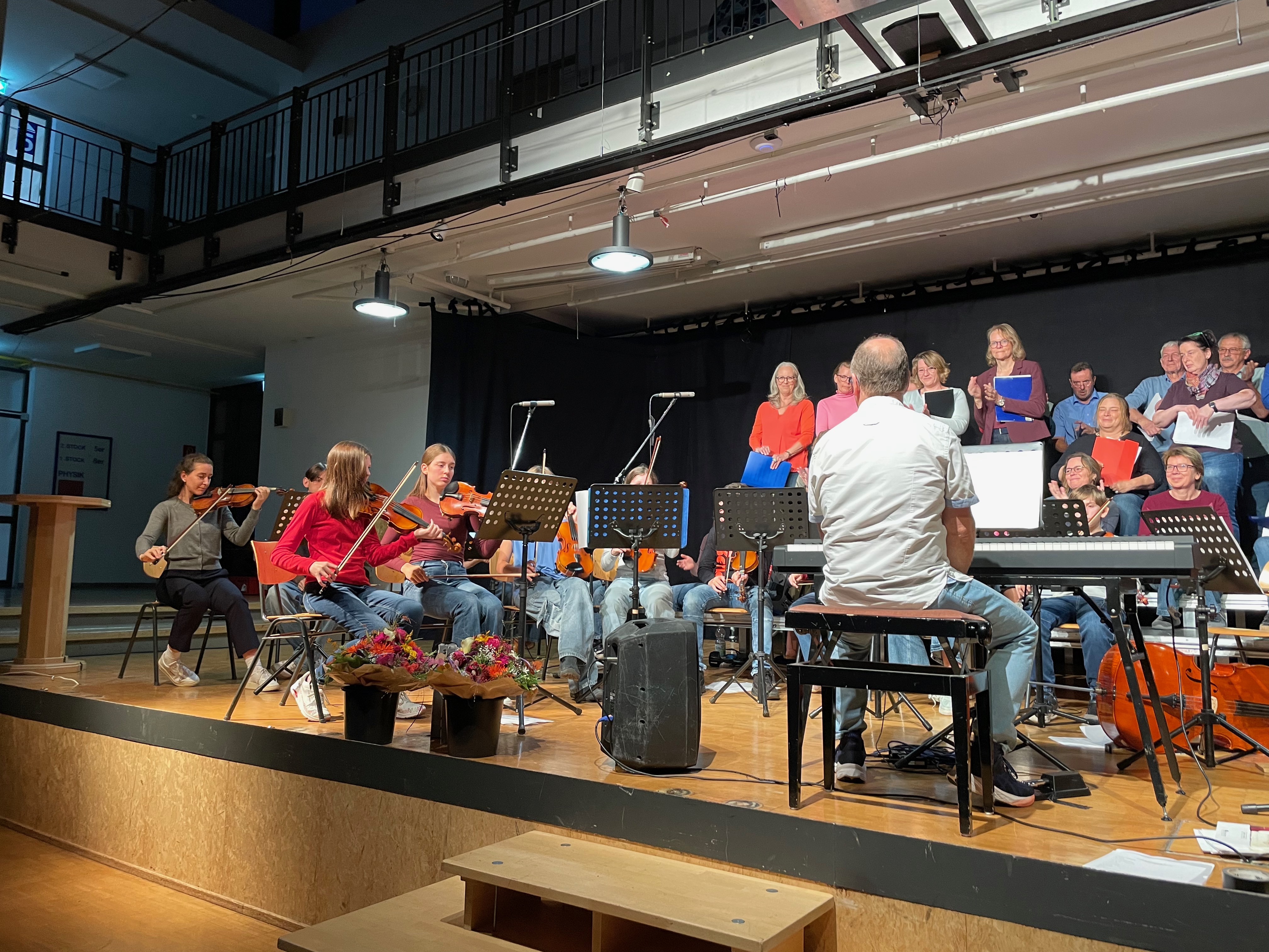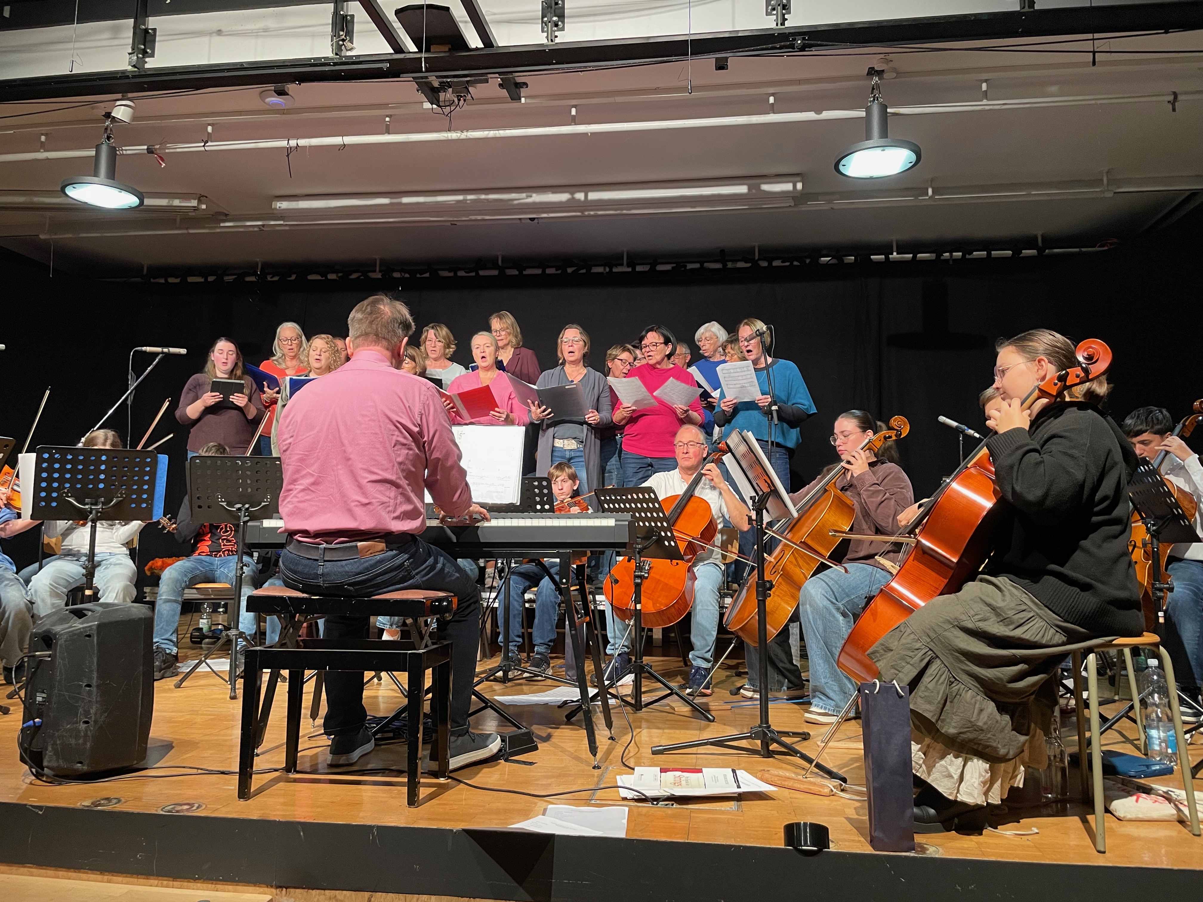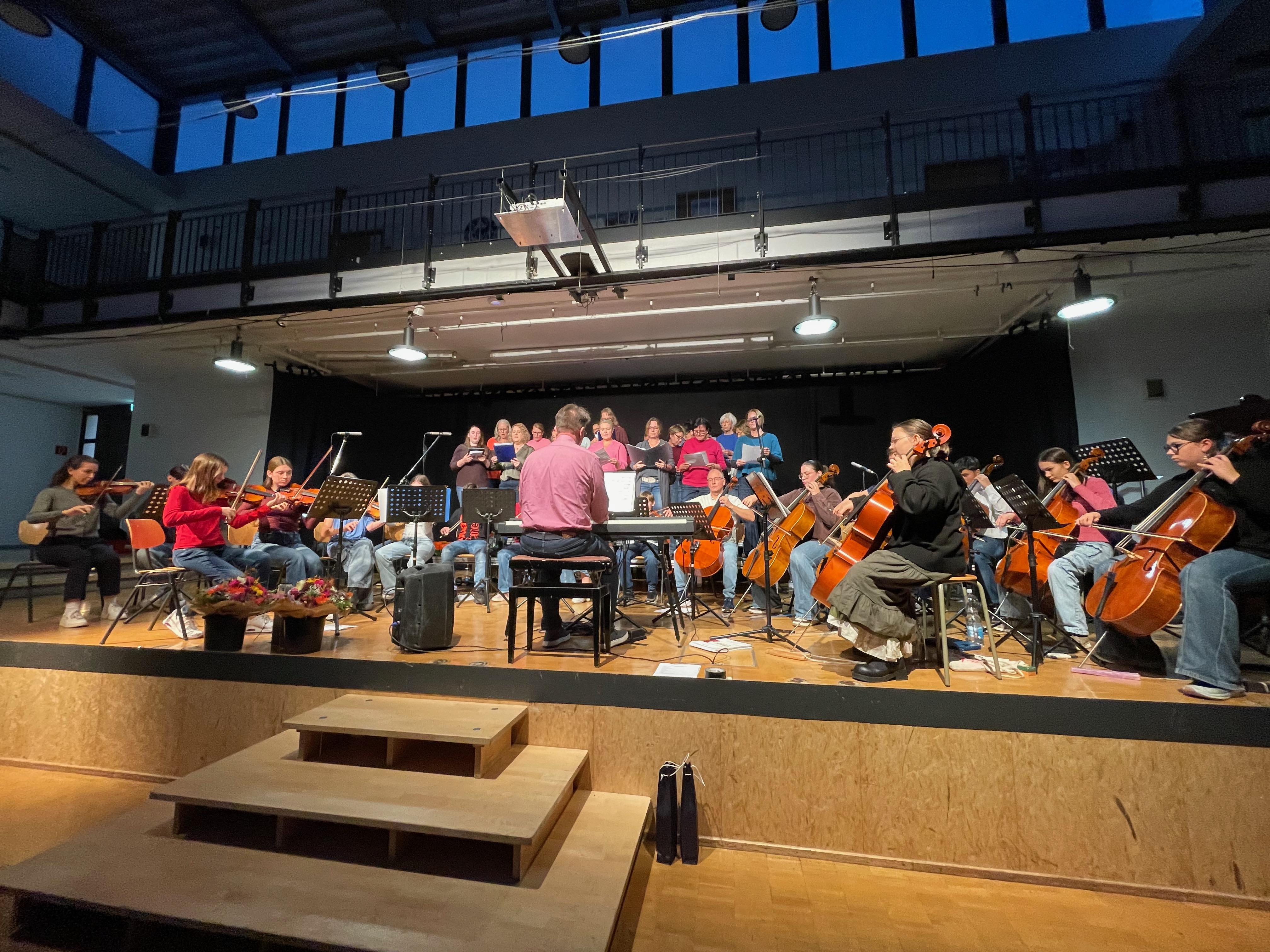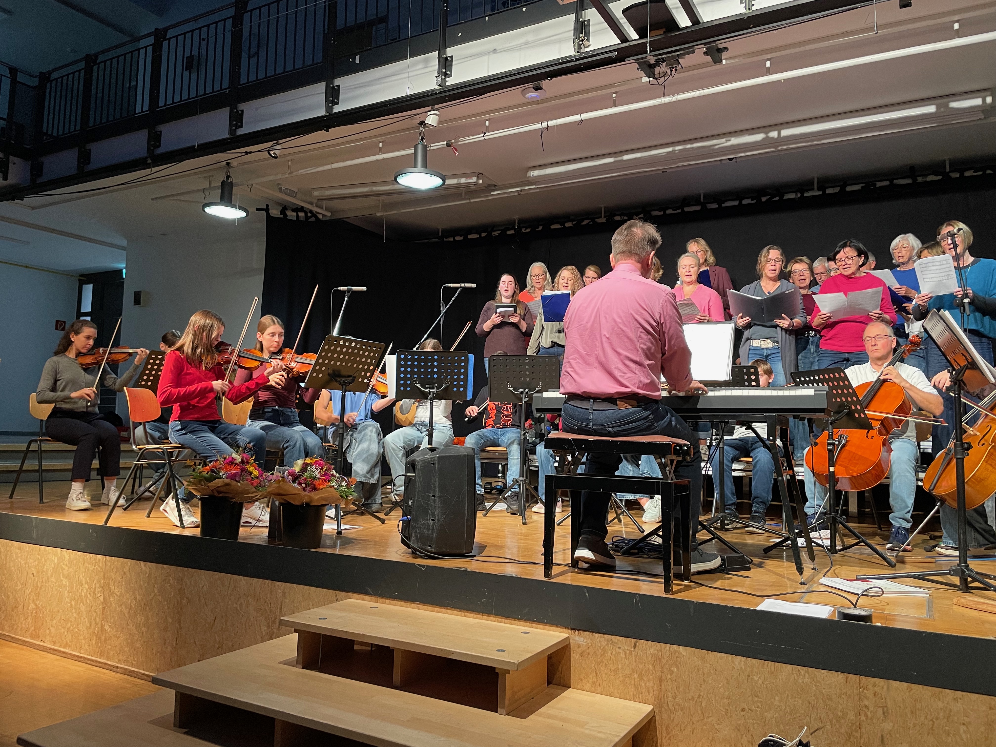 Nachdem unser Schulorchester in den letzten Jahren mehrfach der Einladung nach Heidesheim gefolgt ist, um zusammen mit dem Chor "Klangfarben" aufzutreten, ist der dieser nun erstmals zu Gast in unserer Schule. Unterstützung bekam er durch einen Projektchor mit Sängerinnen und Sängern aus dem Kollegium der IGS.