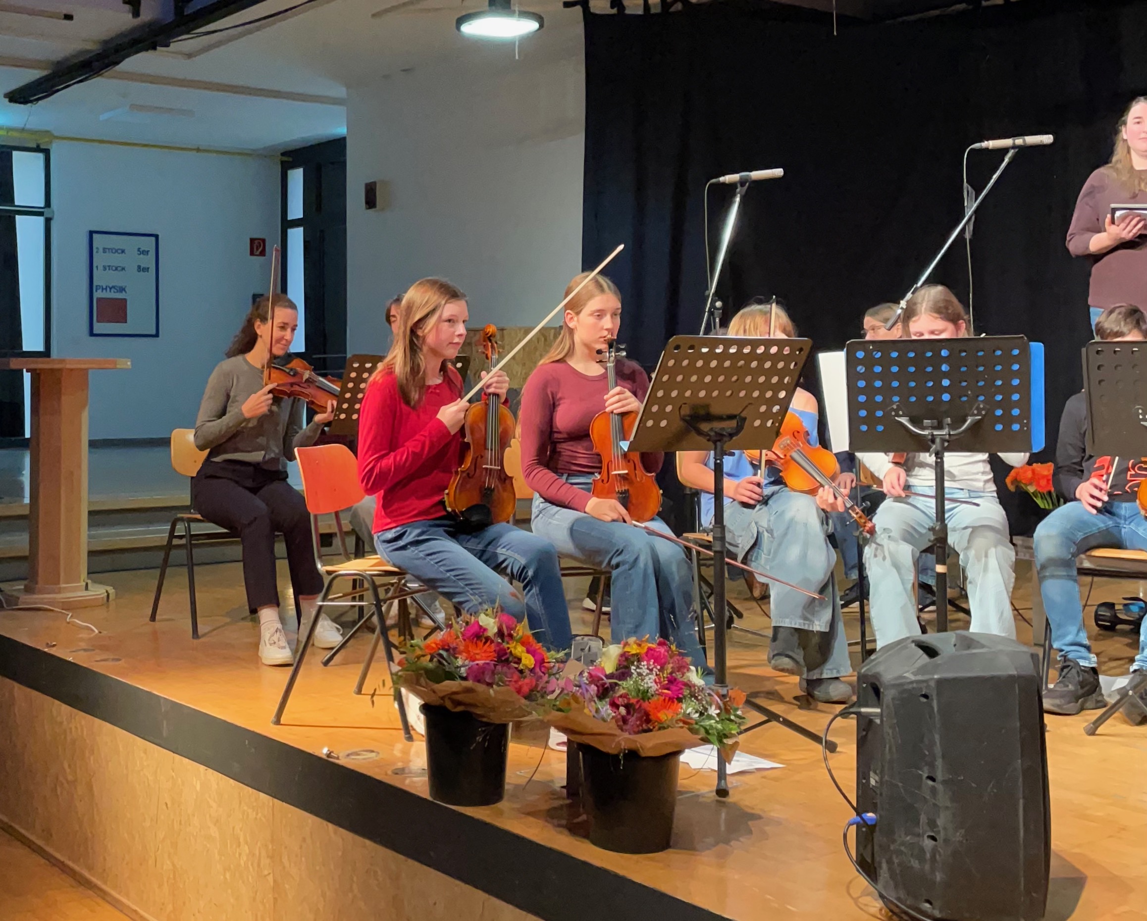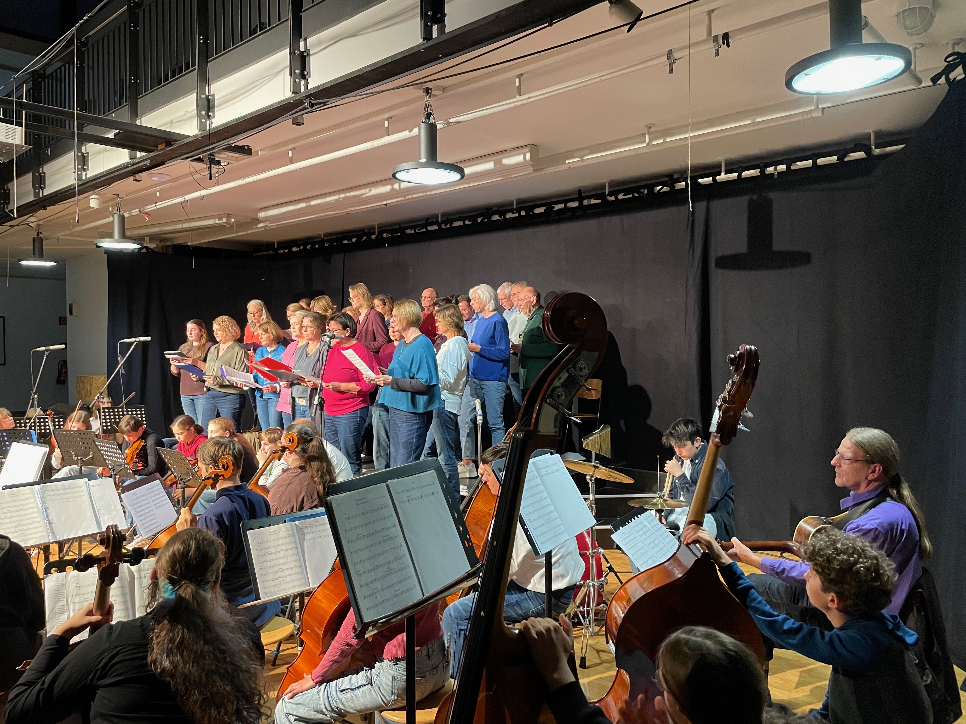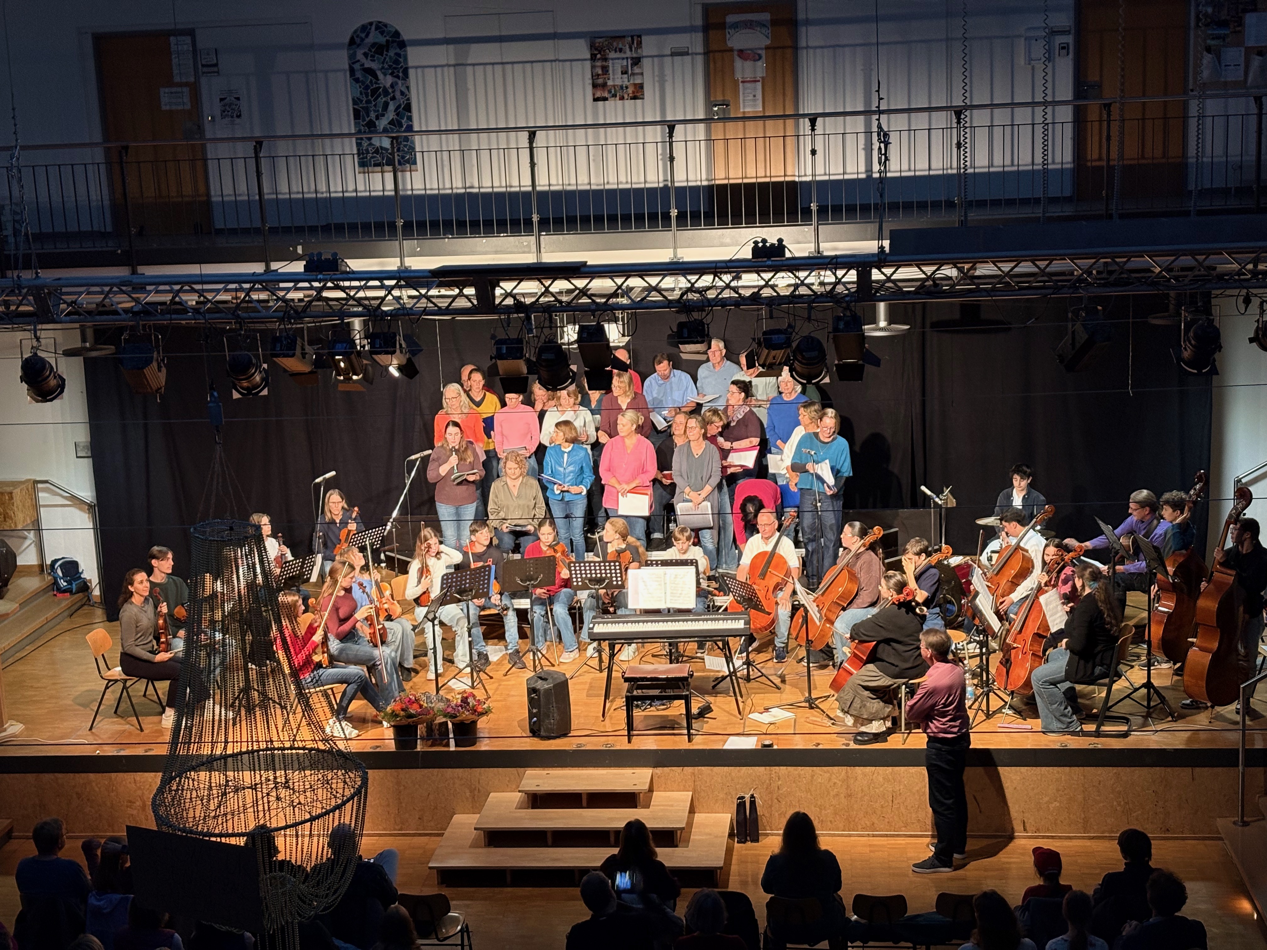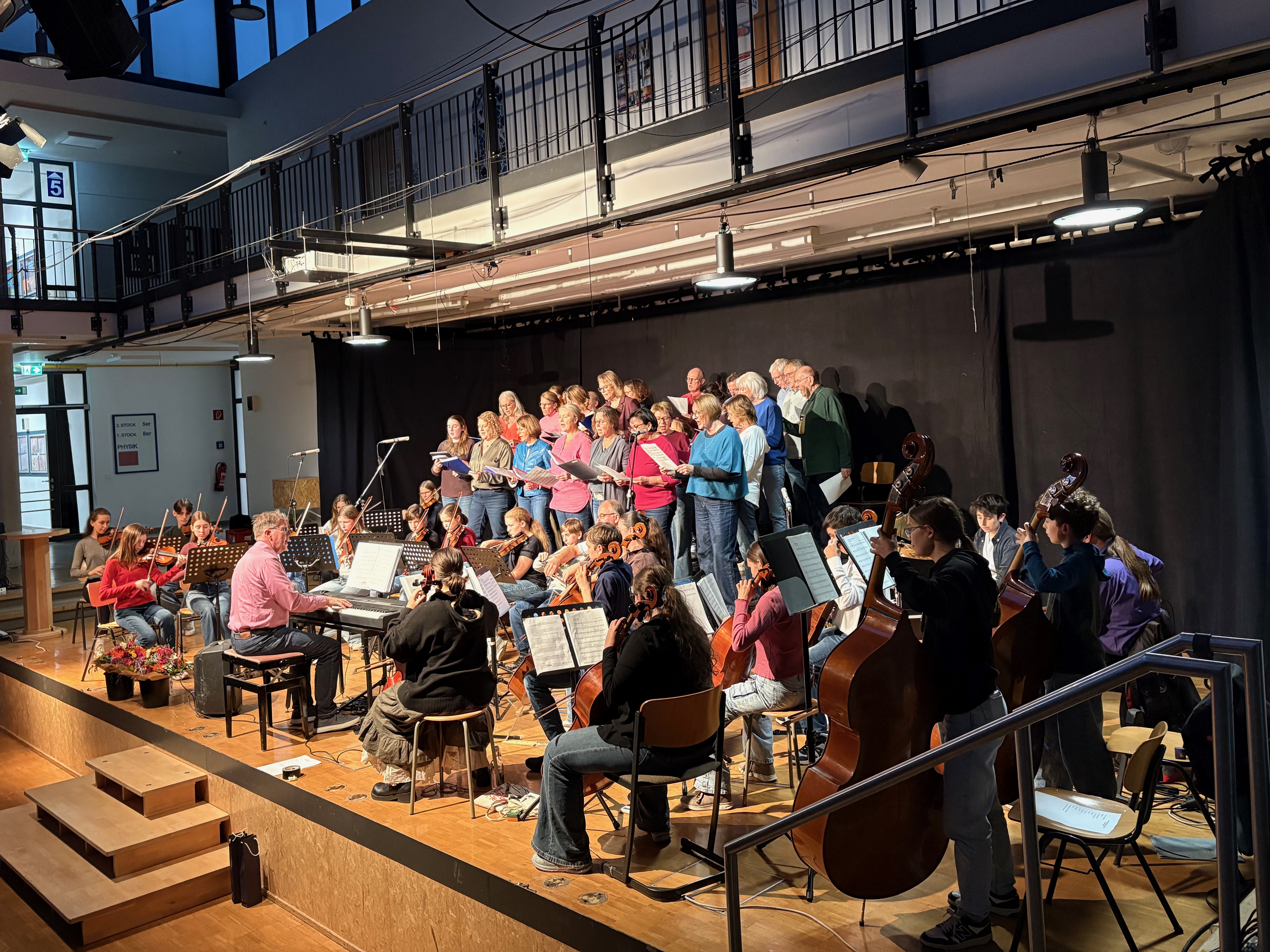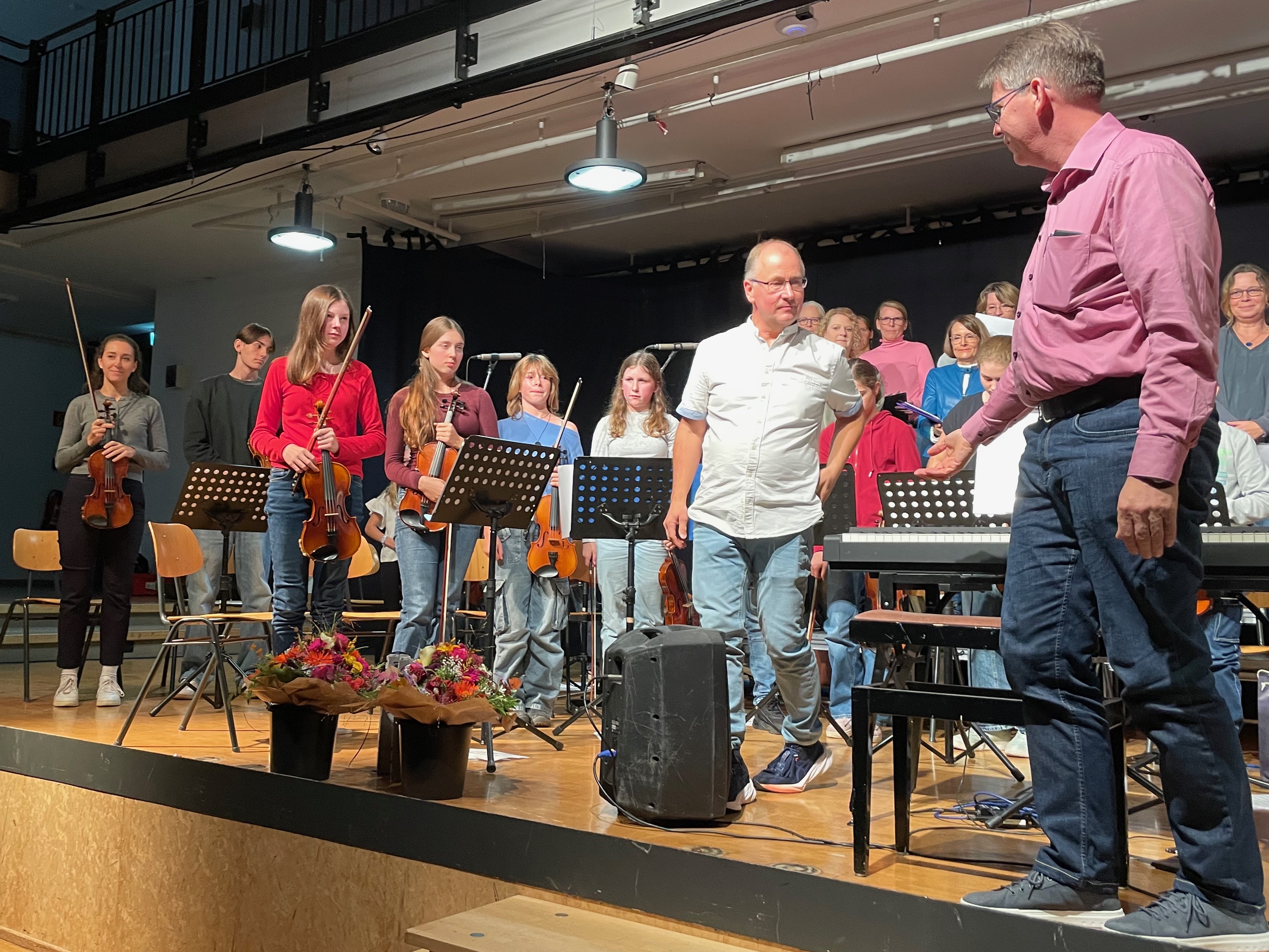 Nachdem unser Schulorchester in den letzten Jahren mehrfach der Einladung nach Heidesheim gefolgt ist, um zusammen mit dem Chor "Klangfarben" aufzutreten, ist der dieser nun erstmals zu Gast in unserer Schule. Unterstützung bekam er durch einen Projektchor mit Sängerinnen und Sängern aus dem Kollegium der IGS.