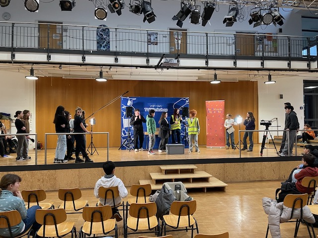 Unsere SchülerInnen hörten gebannt zu, als Richard von seinem derzeitigen Filmprojekt und Becky von ihrer Erfahrung als Musical- und Theaterdarstellerin erzählte. Dann wurde es spannend für alle, denn auf der Bühne unserer Aula entstand ein TV-Set und die verschiedenen Rollen von RegisseurIn über Kameramann/-frau bis hin zu den SchauspielerInnen mussten besetzt werden. Schnell fanden sich genügend Mutige und während Richard den Umgang mit den Kameras sowie die Funktion der Regieklappe erklärte und noch schnell Haarbürsten an die Make-Up-Artists verteilte, übte Becky in einem Nebenraum mit 6 SchauspielerInnen eine Einbruchsszene in einem Museum ein.