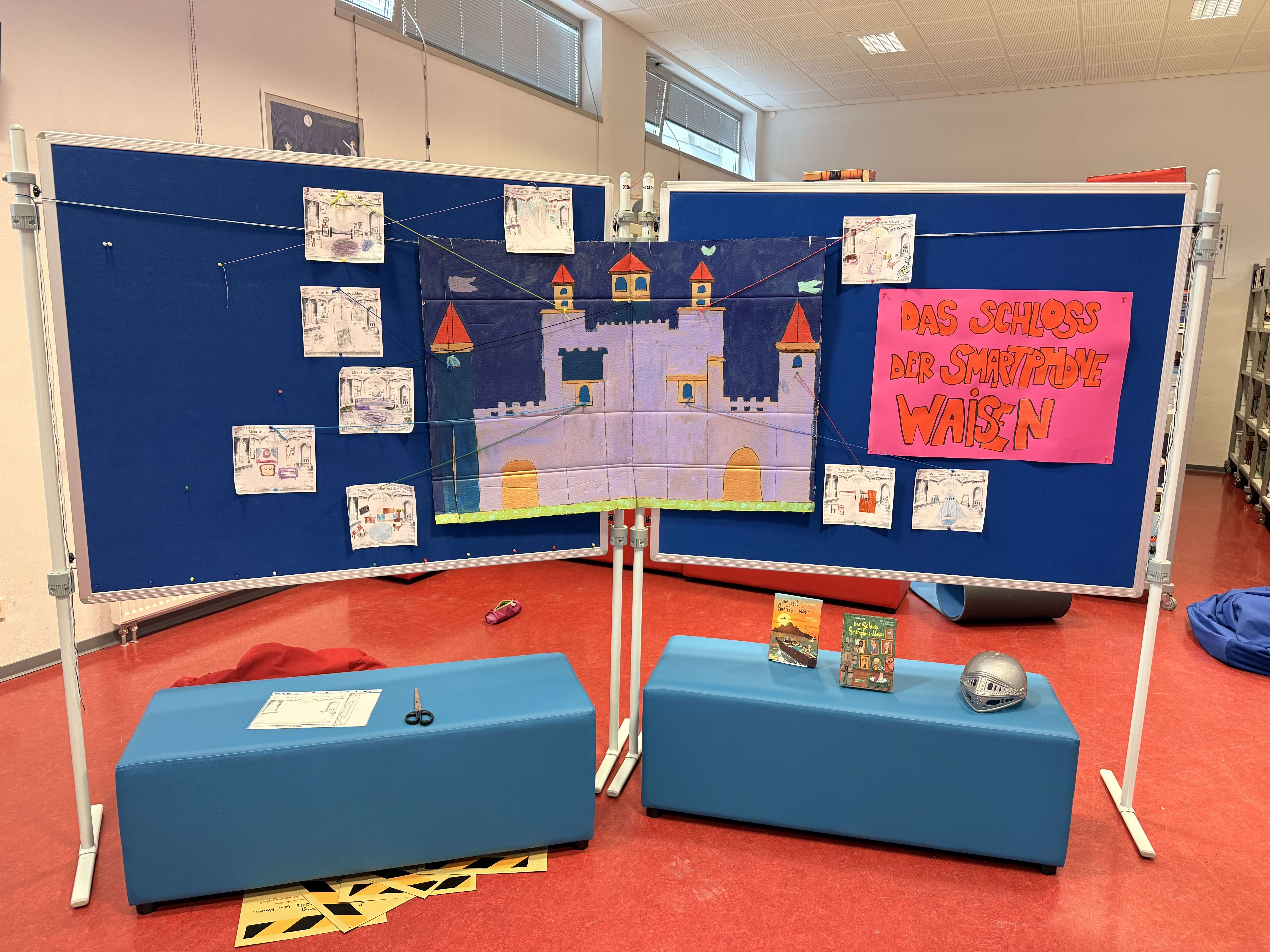 Eine Aktivität, die die Kinder am meisten mochten, war als sie ihr Traumzimmer im Schloss planen sollten. Diese gezeichneten Zimmer wurden dann mir bunten Fäden, den Lieblingsorten im Schloss zugeordnet. Das riesige Schloss, in welches die Kinder ihre Zimmer hinhängten, wurde von der Bibiliotheks AG wunderschön bunt gestaltet. Dies ist aktuell in der Bibiliothek zu finden.